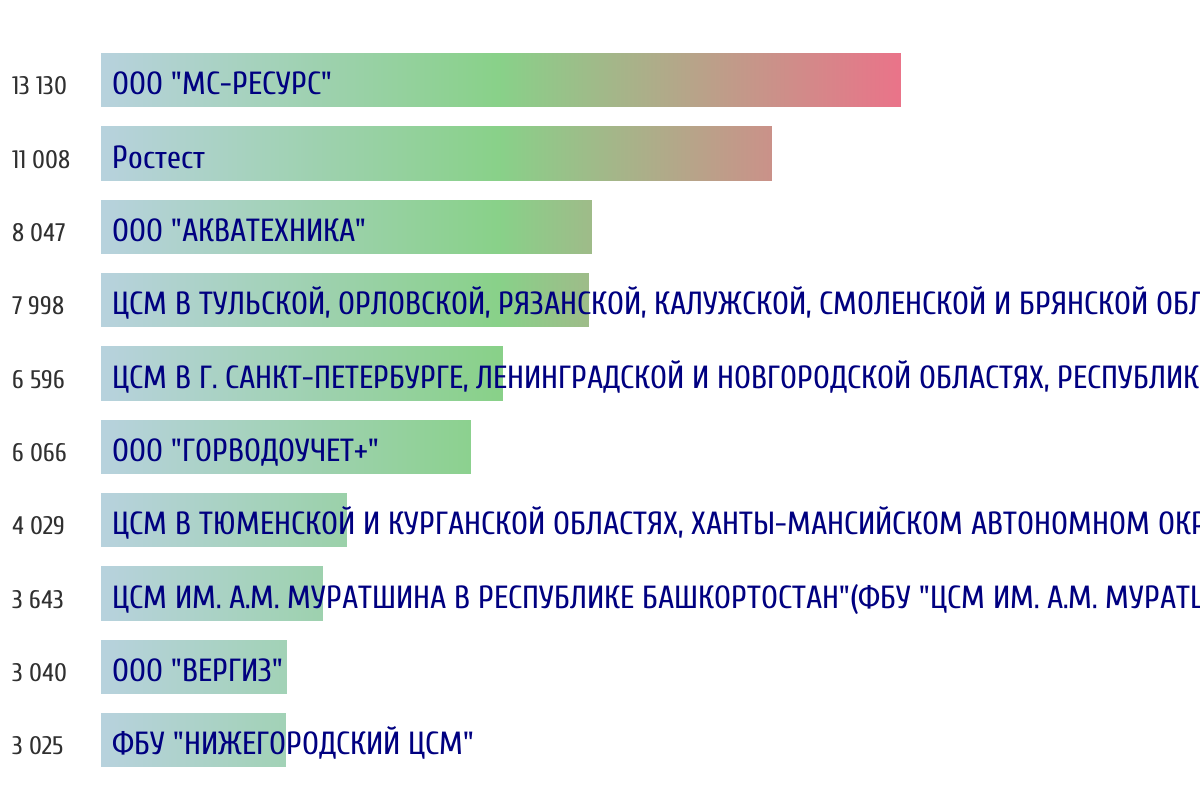 Топ 10 организаций-поверителей по объему первичной поверки за прошлый день 📅 Данные за период с 2026-03-13 00:00:00 по 2026-03-13 23:59:59